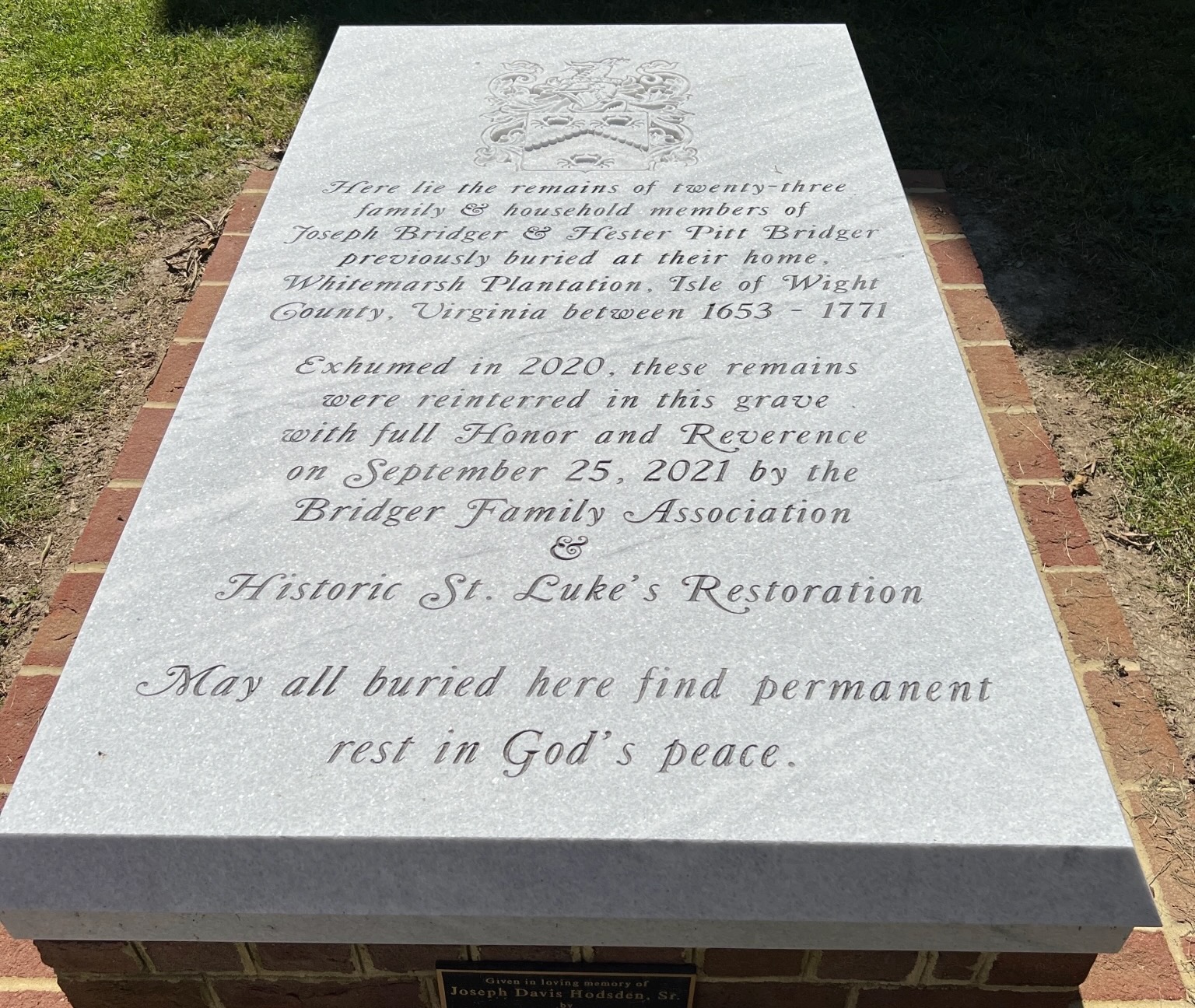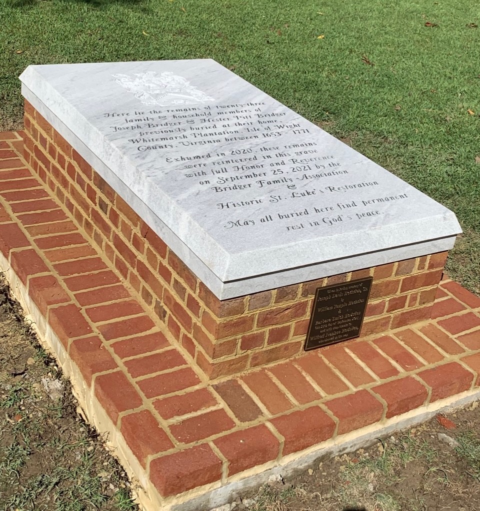 For our first reunion in over two years, the family gathered on May 17, 2022, to hold a memorial service for the 23 souls moved from the cemetery at Whitemarsh in September 2021. Their remains now repose at St. Luke’s Church in a beautiful crypt donated by a Bridger family member. Some bricks from their Whitemarsh home were interred with them.