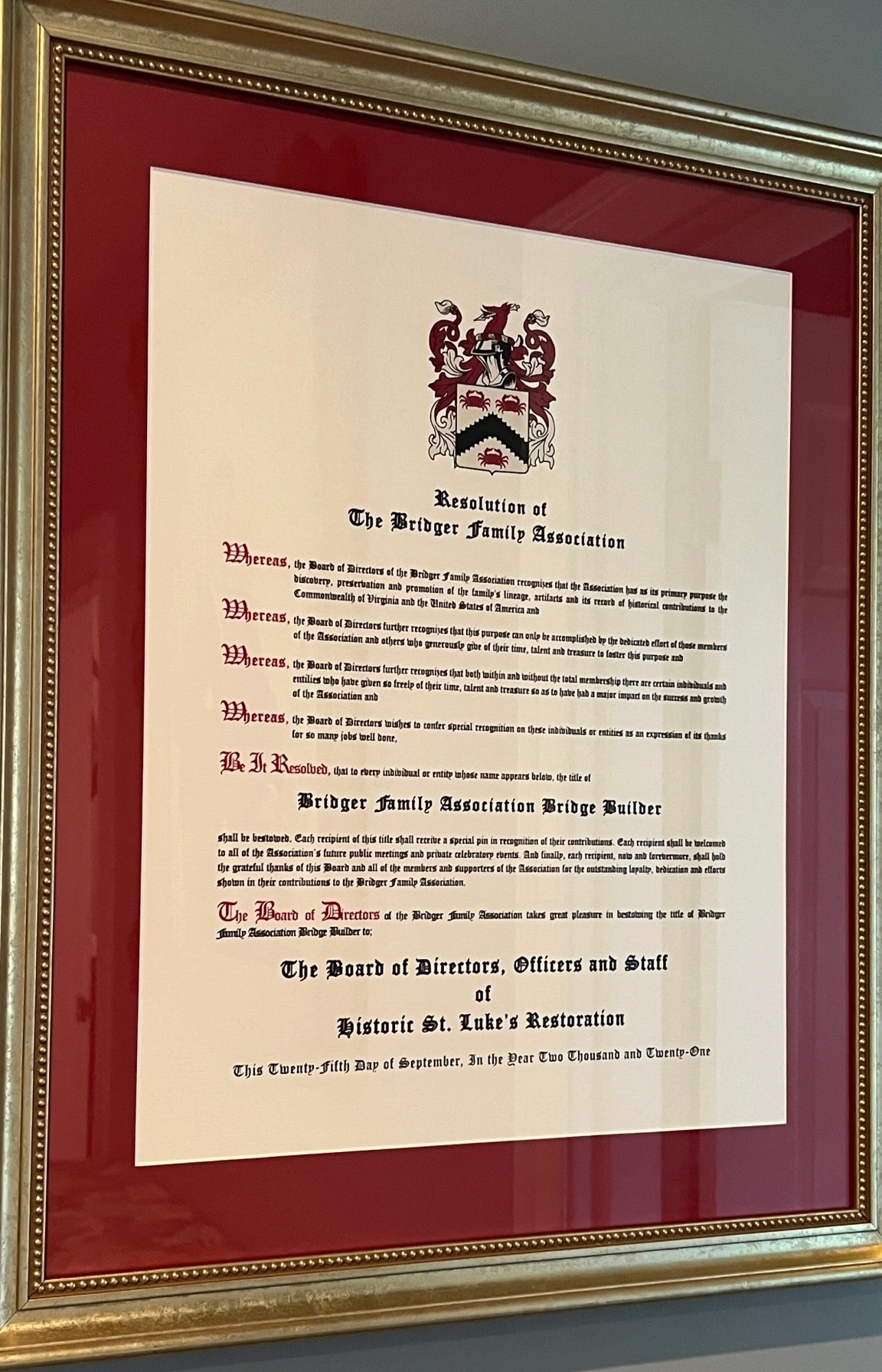 In 2020, Historic St. Luke’s Restoration and the Bridger Family Association created The Bridger Family Association Legacy Fund that is exclusively dedicated to general operations support and future genealogical research. Members of the Bridger Family Association are invited to leave estate gifts to support this Fund. Contact John Ericson (757)357-3367 for more information. The fund currently has $400,000 in pledged legacy gifts.